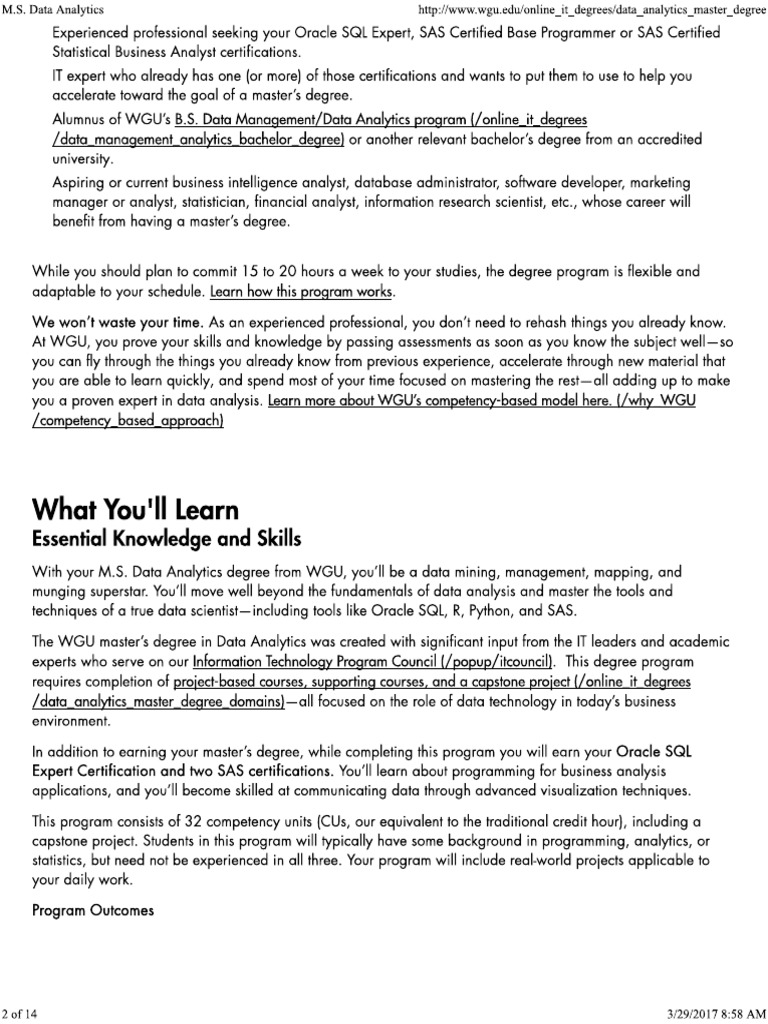 Program Guidebook Master of Science, Data Analytics The MS Data Analytics degree prepares statisticians, analysts, data managers, programmers, and other business and IT professionals for successful and rewarding careers in the high-demand field of data analytics through cutting-edge courses in ... Return Document